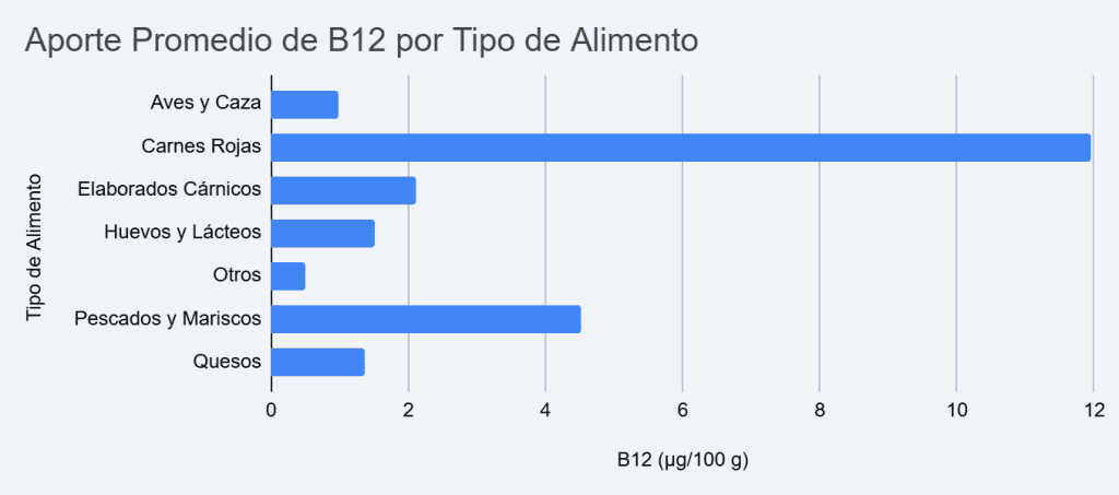 El gráfico permite comparar visualmente el contenido promedio de B12 entre diferentes categorías de alimentos y muestra que los «Carnes Rojas» tienen el mayor aporte promedio de B12, seguidos por «Pescados y Mariscos», pero eso NO significa que en una dieta saludable como la Mediterránea, que es la que más recomiendo, deban abundar las carnes rojas, que deben consumirse con baja frecuencia, no todos los días, ni más de 1-2 veces por semana. Entonces, te recomiendo mucho más los pescados, sobre todo, los azules.